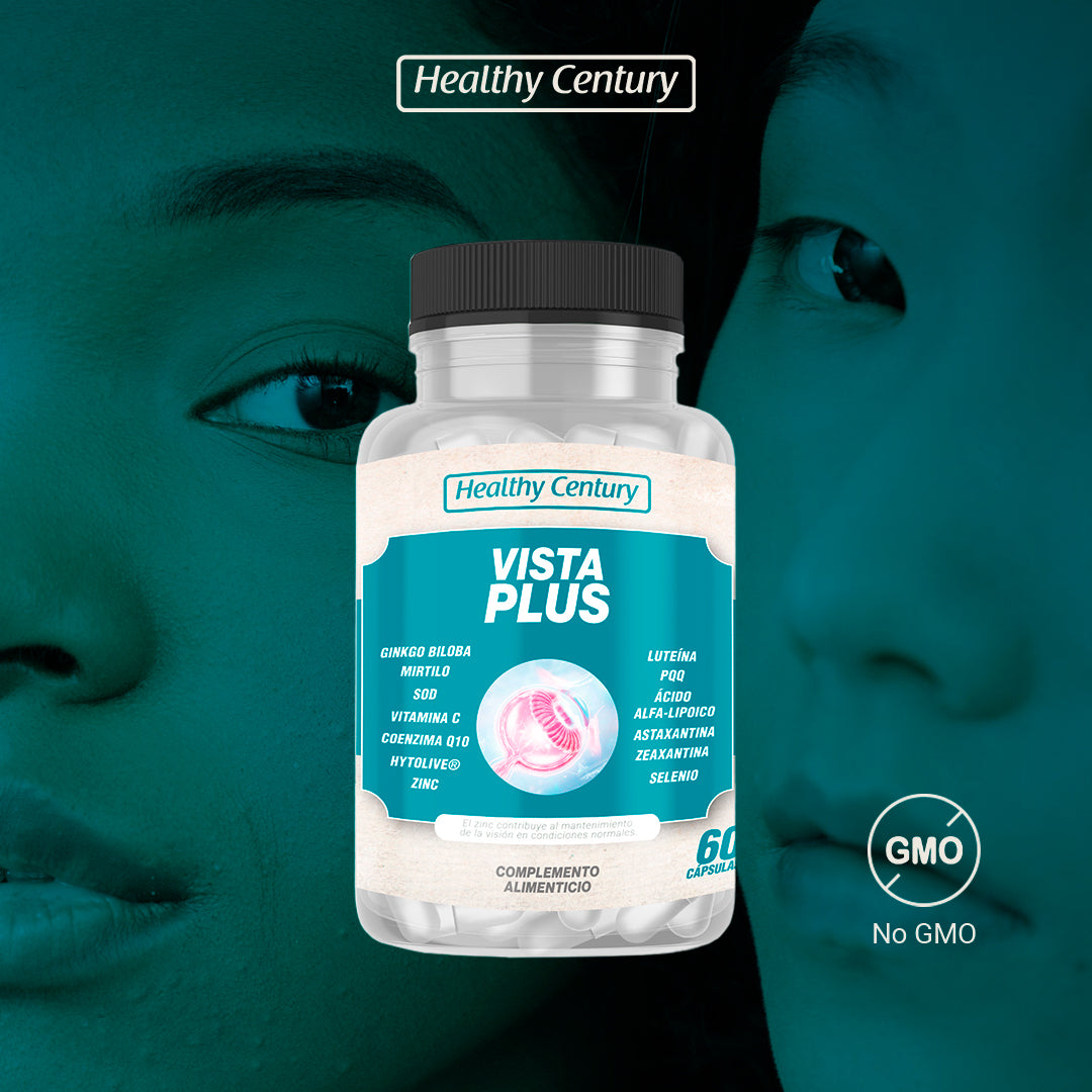 Vista Plus de Healthy Century es un complemento alimenticio avanzado para el cuidado y protección de la visión. Su fórmula completa combina Luteína, Zeaxantina, Astaxantina, Mirtilo, Ginkgo Biloba, Vitamina C, Coenzima Q10, Zinc, Selenio y Ácido Alfa-Lipoico. Un tratamiento natural diseñado para fortalecer la retina, proteger los ojos de las radiaciones UV, combatir la fatiga visual y prevenir el deterioro asociado a la edad.