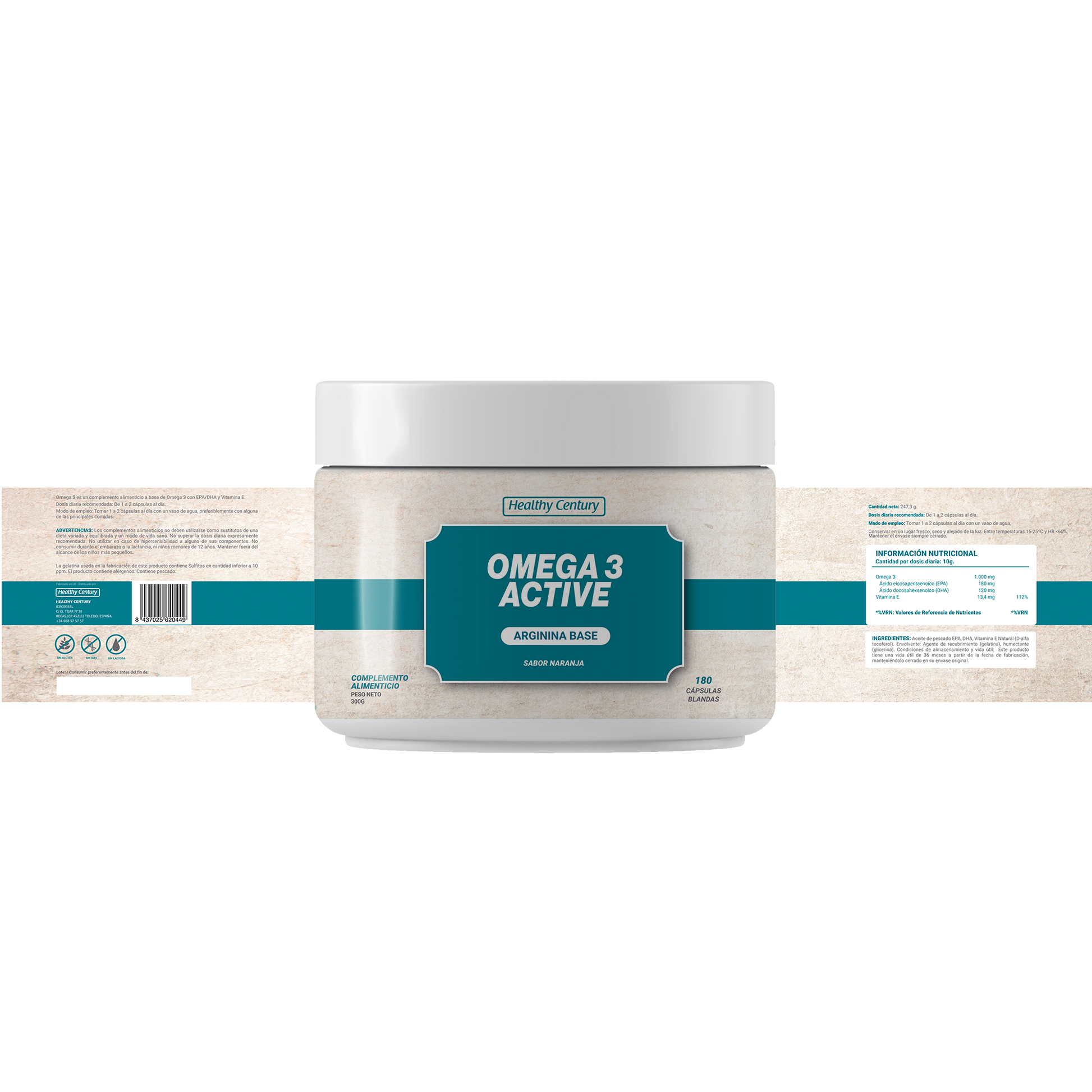 Omega 3 Active de Healthy Century es un complemento alimenticio a base de Omega 3 con EPA, DHA y Vitamina E, formulado en cápsulas blandas para una fácil absorción. Con 1000 mg de Omega 3 por dosis, proporciona los ácidos grasos esenciales que el cuerpo no puede producir por sí mismo, fundamentales para la salud cardiovascular, cerebral y articular.